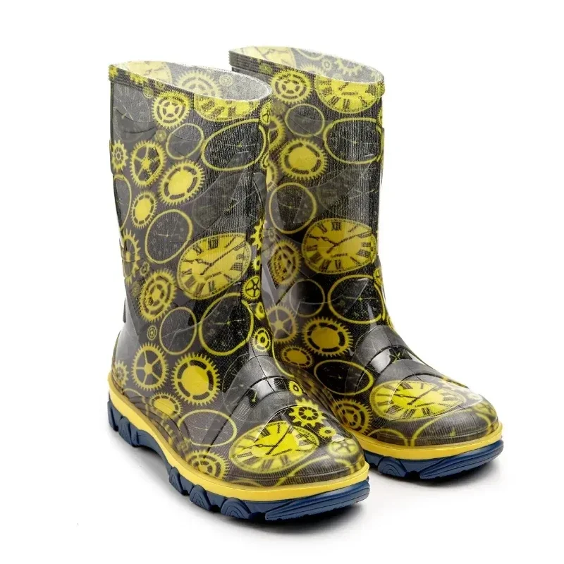 Дитячі гумові чоботи з принтом «Годиники» поєднують оригінальний дизайн і надійний захист від дощу. Суцільнолита конструкція з ПВХ без фталатів робить взуття повністю водонепроникним і безпечним. Усередині — м’яка підкладка з поліестеру з еластоміром для зручності. Рельєфна підошва гарантує стійкість навіть на мокрих поверхнях. Вироблено в Україні.