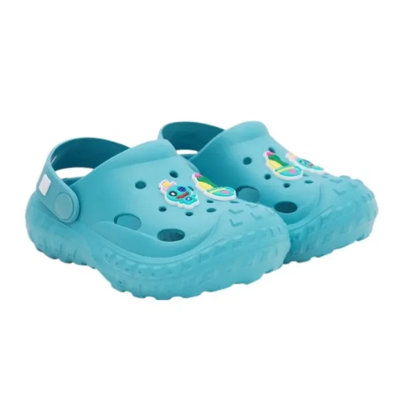 Блакитні дитячі крокси-сабо Dago — легке та зручне літнє взуття для хлопчиків. Виготовлені з м’якої піни ЕВА, вони не натирають, легко миються та забезпечують амортизацію. Вентиляційні отвори гарантують повітрообмін, а задній ремінець фіксує ногу. Яскраві Jibbitz-прикраси у вигляді роботів та сердечок додають стилю. Ідеальні для садочка, пляжу та прогулянок.
