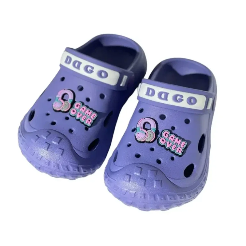 Фіолетові дитячі крокси Dago — стильне та зручне взуття для літа. Виготовлені з гіпоалергенної піни ЕВА, вони легкі, гнучкі, не натирають і швидко сохнуть. Вентиляційні отвори забезпечують повітрообмін, а задній ремінець надійно фіксує ногу. Яскраві прикраси з написом Game Over додають оригінальності. Ідеальні для садка, прогулянок та відпочинку.