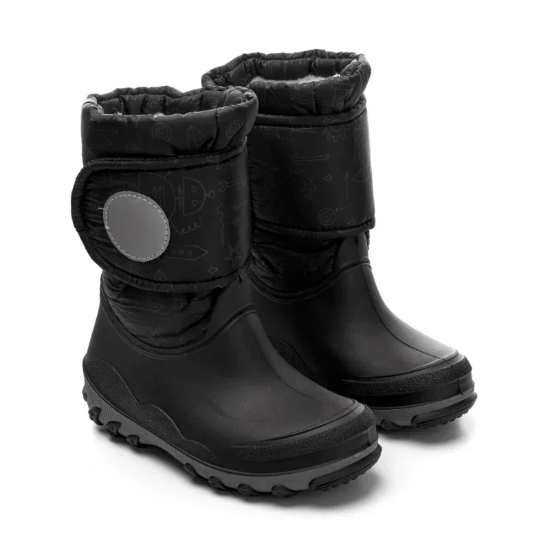 Дитячі зимові чоботи Оскар Чорні — теплі, водонепроникні та стійкі до морозів до -30°C. Нижня частина з ТЕП забезпечує герметичність і зносостійкість, а рифлена підошва гарантує безпеку на слизькій поверхні. Верх із текстилю з водовідштовхуючим покриттям і хутряна підкладка з 30% вовни зберігають тепло та комфорт навіть під час активних ігор на снігу.