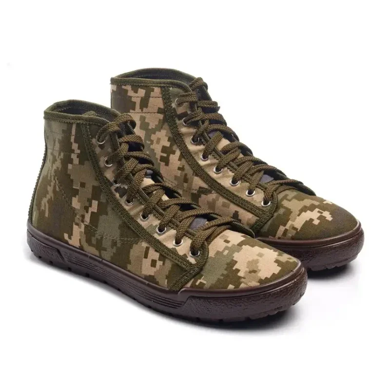 Чоловічі кеди Еван «піксель» — практичне та стильне взуття для міста й активного відпочинку. Верх і підкладка з натуральної бавовни забезпечують легкість і вентиляцію, а коричнева поліуретанова підошва дарує гнучкість і зносостійкість. Високий крій фіксує ногу, а цифровий камуфляж додає сучасного військового стилю.