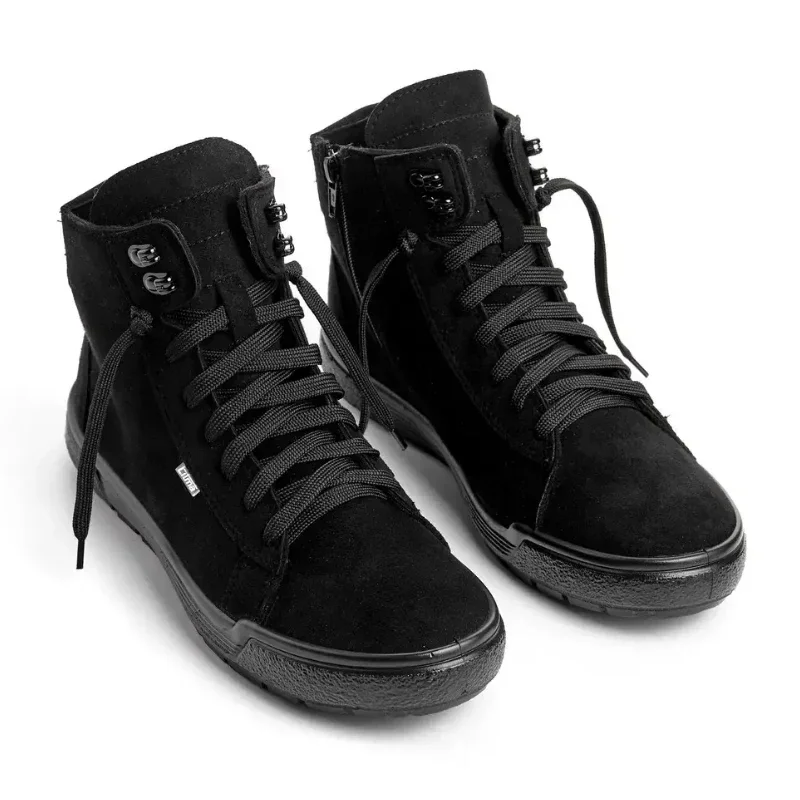 Високі чоловічі кеди Парма чорного кольору — стильне та зручне взуття для міста. Верх із ворсованої тканини під замш додає елегантності, а флісове утеплення дарує тепло в прохолодну пору. Високий крій добре фіксує ногу, блискавка з боку полегшує взування, а легка спінена підошва з ПУ забезпечує комфорт і зносостійкість. Вироблено в Україні.