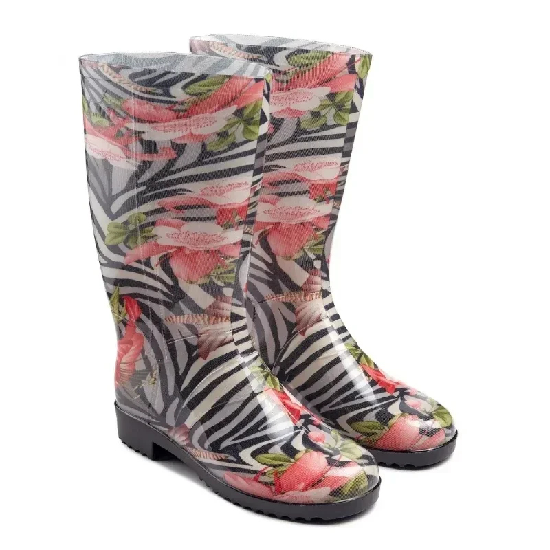 Жіночі гумові чоботи з принтом рожевих квітів на фоні зебрових смуг — яскраве та стильне рішення для дощової погоди. Виготовлені з безпечного ПВХ без фталатів методом суцільнолиття, вони водонепроникні та довговічні. Усередині — підкладка з поліестеру з еластоміром для щоденного комфорту. Рельєфна підошва гарантує стійкість навіть на слизьких поверхнях.