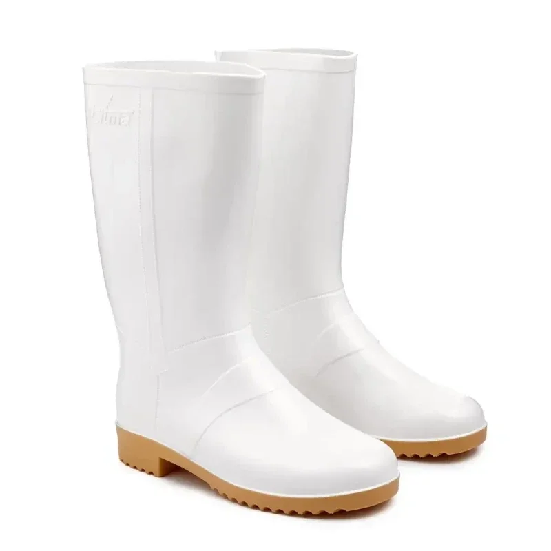 Жіночі гумові чоботи білого кольору — стильний та практичний вибір для дощової погоди. Виготовлені з безпечного ПВХ без фталатів методом суцільнолиття, вони водонепроникні, довговічні та легко миються. Усередині — м’яка підкладка з поліестеру з еластоміром. Контрастна рифлена підошва гарантує стійкість на слизьких поверхнях.