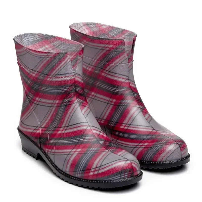 Жіночі гумові чоботи Літма у сіро-червону клітинку — стильне та практичне рішення для дощової погоди. Завдяки суцільнолитому корпусу з ПВХ без фталатів вони повністю водонепроникні, легко миються та служать довго. Усередині м’яка підкладка з поліестеру та еластомеру забезпечує комфорт. Рельєфна підошва захищає від ковзання.