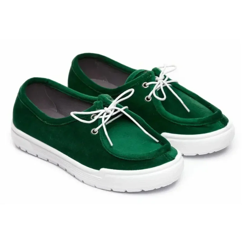 Жіночі мокасини MELANIA у насиченому зеленому кольорі поєднують комфорт і стиль. Верх із м’якої ворсованої тканини з ефектом замші виглядає елегантно та приємно на дотик. Контрастна біла підошва з ПВХ легка, гнучка й зносостійка. Ідеальні для прогулянок, роботи та подорожей у теплий сезон.