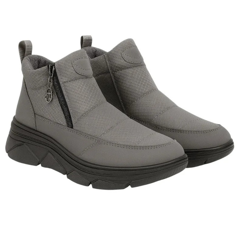 Жіночі короткі черевики-дутики Даго у сірому кольорі — зручне та тепле рішення для холодної пори року. Верх із плащівки та еко-нубука забезпечує захист від вологи, а штучне хутро всередині гарантує комфорт і тепло. ПВХ-підошва заввишки 2,5–4 см дарує стійкість і амортизацію. Завдяки блискавці взуття легко взувати та носити щодня.