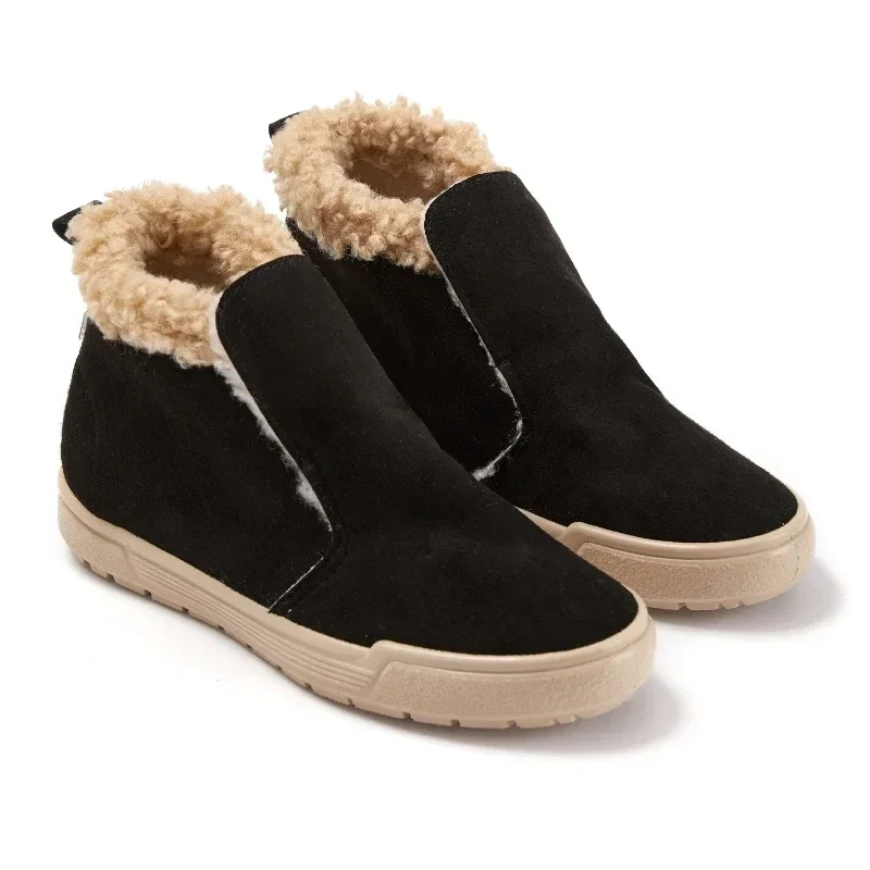 Жіночі зимові черевики Доменіка Теді у чорному кольорі — тепле та зручне взуття для холодного сезону. Верх з ворсованої тканини під замшу надає елегантного вигляду, а хутро з 30% вовни всередині дарує комфорт навіть у мороз. Легка підошва зі спіненого поліуретану забезпечує амортизацію, не ковзає та підходить для щоденного використання в місті.