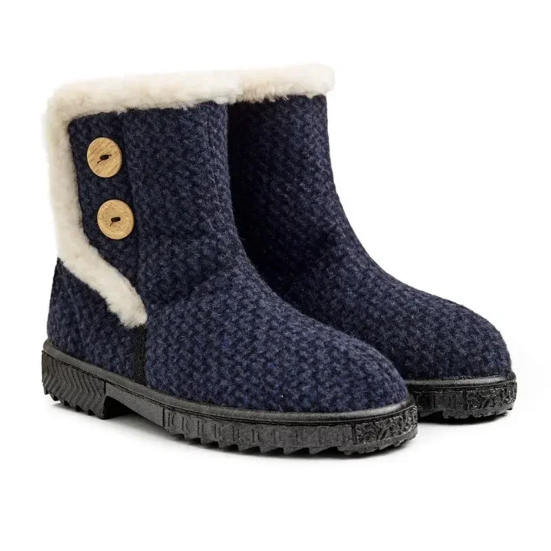 Жіночі бурки Грета у синьому кольорі — теплі та комфортні зимові чоботи. Верх із текстилю (акрил, поліестер, бавовна) поєднує легкість і міцність. Усередині м’яке біле хутро з вмістом вовни (30%) дарує тепло та затишок. Спінена ПВХ-підошва, виготовлена строчно-литтєвим методом, забезпечує легкість і довговічність. Дерев’яні ґудзики та липучка додають оригінальності й зручності.